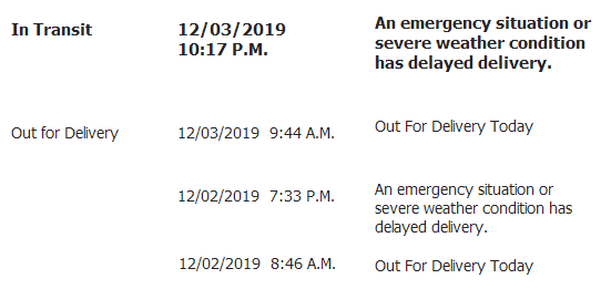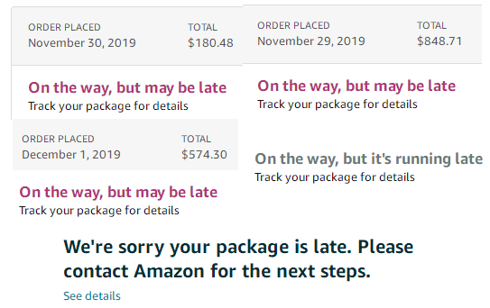 "Your package scheduled for delivery on Monday, 12/09/2019 may be delayed due to unexpected circumstances. We apologize for any inconvenience this may cause." Par for the course,
