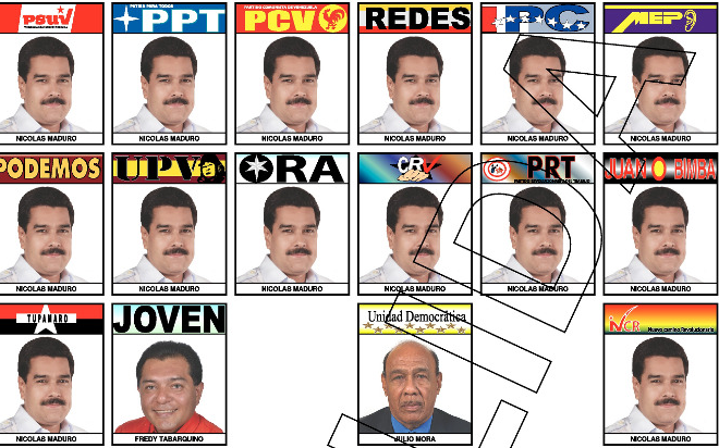 Came across the voting card for Venezuela's last semi-competitive presidential elections, in 2013. There was already plenty of Maduro to choose from back then (Capriles was a lone face in the bottom corner).pic.twitter.com/2Tii5GV3ht