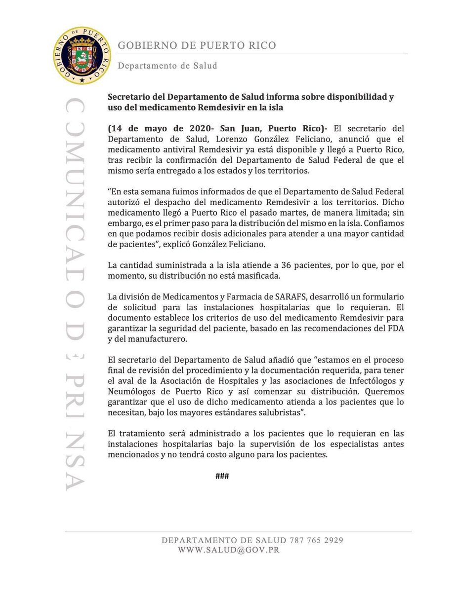 [Comunicado de Prensa] Secretario Lorenzo González informa sobre disponibilidad y uso del medicamento Remdesivir en la islapic.twitter.com/iXj3APe11f