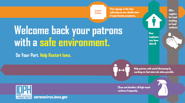 Businesses can help Iowa re-open by providing a safe environment for their patrons. http://Coronavirus.iowa.gov pic.twitter.com/fiUUMnFbTk