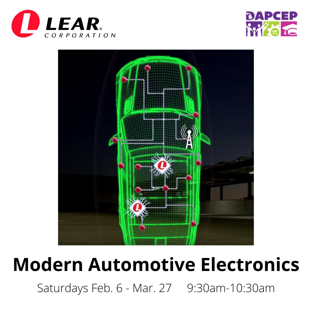 @LearCorporation will offer FREE classes on Modern Automotive Electronics to #@DAPCEP 11th/12th graders on Saturdays from 9:30am-10:30am starting Feb. 6. Learn about V2V communication & more & build 1-1 relationships with Lear leadership. Register here: http://bit.ly/3i1pZof pic.twitter.com/FeEybqKC1j