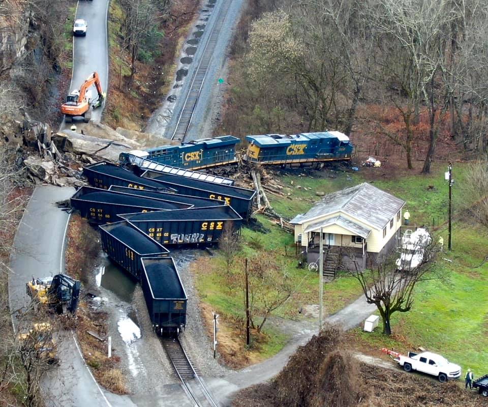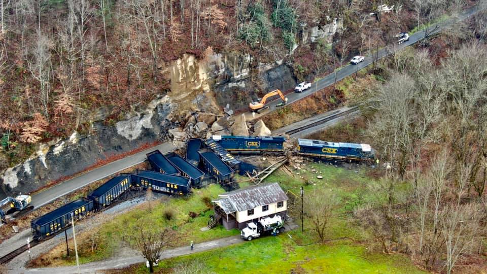 Absolutely wild photos from a train wreck in Harlan County, KY today: And yes, that is a person's house, literally feet from a derailed train car