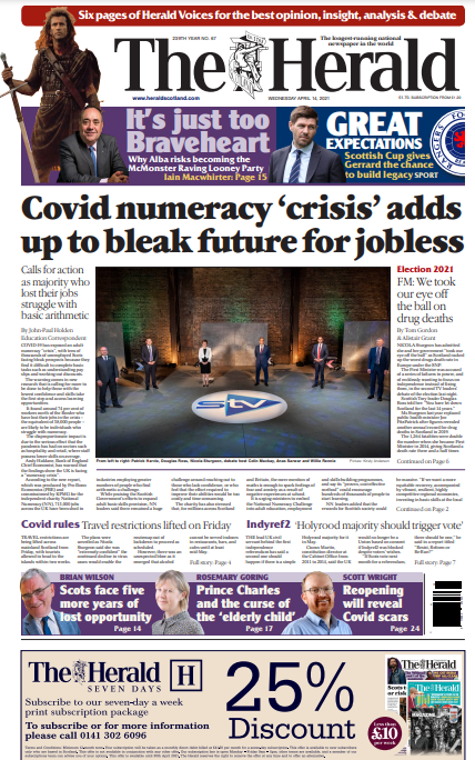 Wednesday's Herald - Covid has exposed an adult numeracy “crisis”, with tens of thousands of unemployed Scots facing bleak prospects - Sturgeon admits she took her eye off the ball on drug deaths
