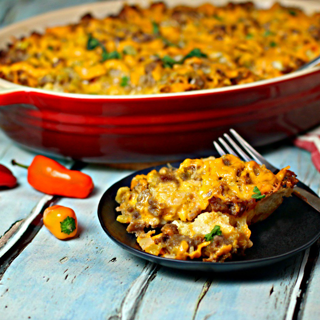 Ho Ho Holiday Breakfast Casserole with Cheesy Sausage Bread Pudding