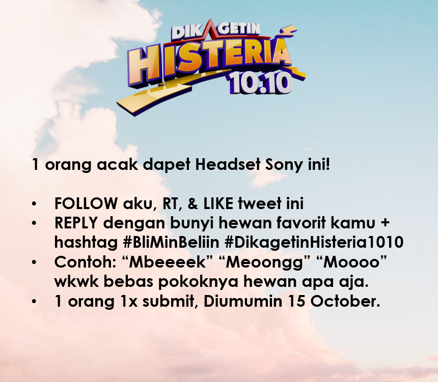 Cek deh syaratnya, trus ini hashtagnya: #BliMinBeliin#DikagetinHisteria1010 Good luck yaah!!