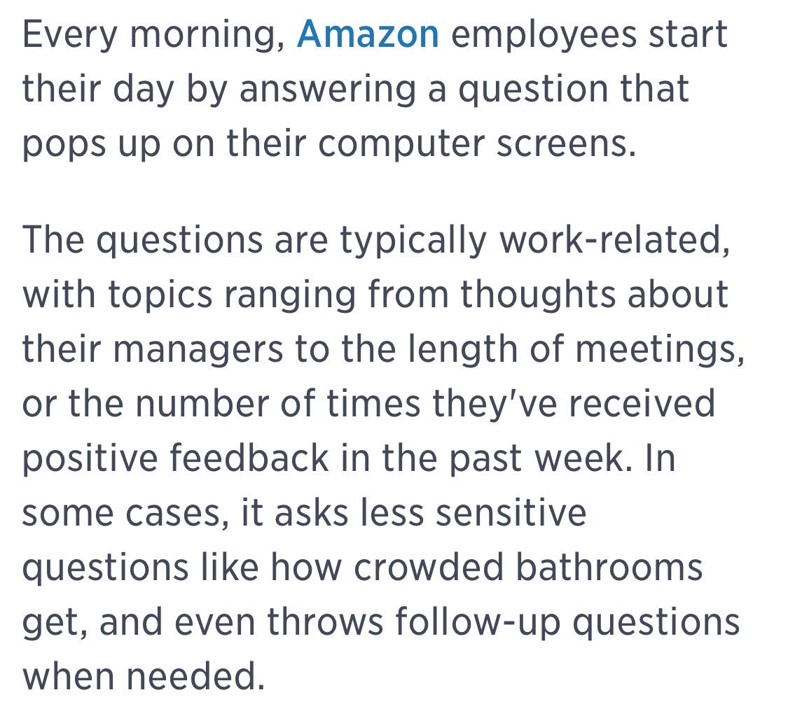 ICYMI: Amazon wants to learn more about its employees. Even hired an ex-Microsoft AI specialist to study feedback. Some employees remain skeptical. tip: