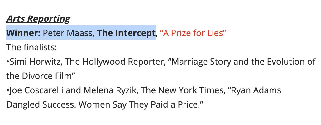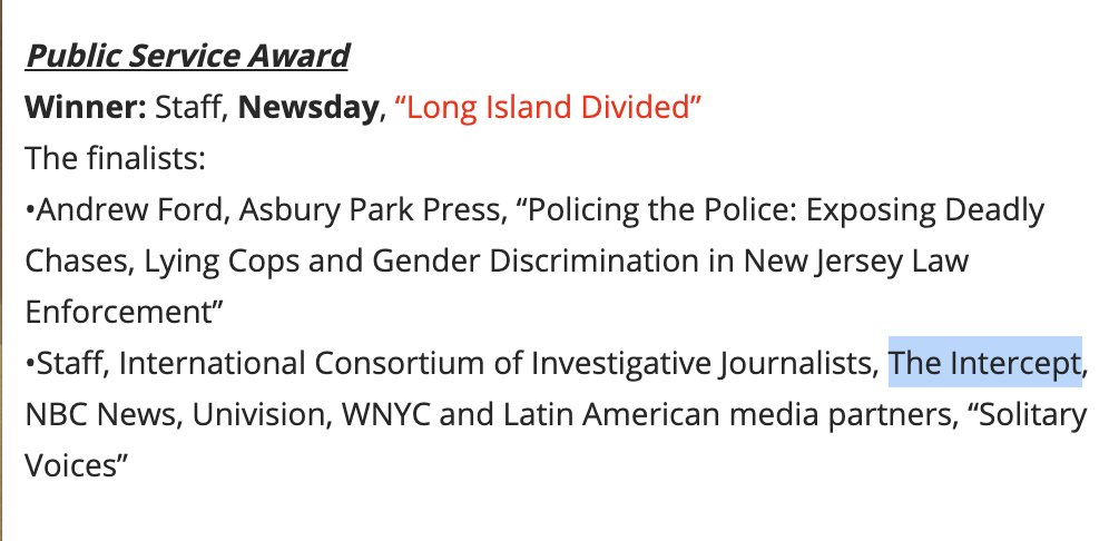 @TheIntercept won 2@DeadlineClub awards last night & was a finalist for a 3rd.@rdevro won a feature prize for his profile of Scott Warren, I won an arts prize for my Peter Handke stories, & a team of TI reporters were finalists for public service. cc@benytpic.twitter.com/h8JqofZpVn