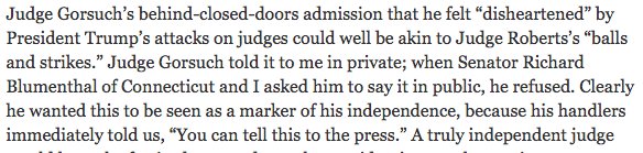 Schumber essentially calls Gorsuch's comments on Trump a PR stunt and accuses John Roberts of being a con artist.https://mobile.nytimes.com/2017/02/10/opinion/sunday/charles-schumer-judge-gorsuch-we-wont-be-fooled-again.html …
