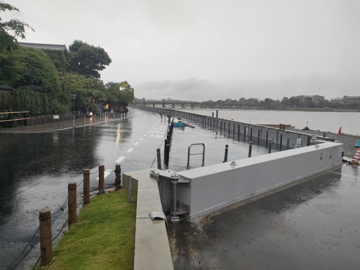 7月7日、大雨による増水に備え、淀川水系桂川の嵐山地区において、可動式止水壁の操作を行いました。 この止水壁は全国初の施設で、今年度から運用を開始し、これが初めての実働となります。