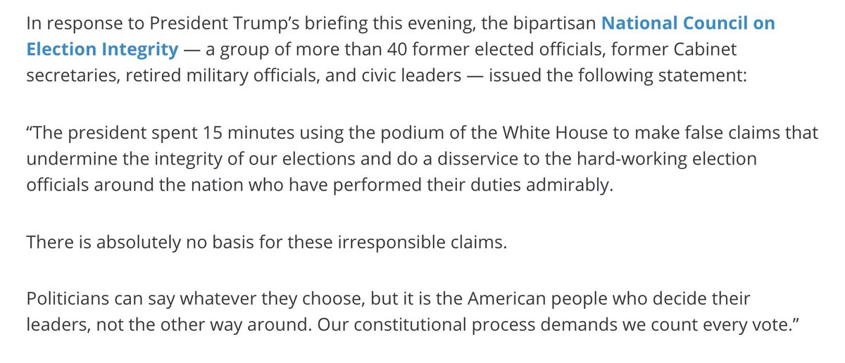 Listen to these people. They are patriots who served their country at the highest levels, half of them Republican, standing against the President's denigration of the Constitution and the American votershttps://twitter.com/CountEveryVote1/status/1324518056123637760 …