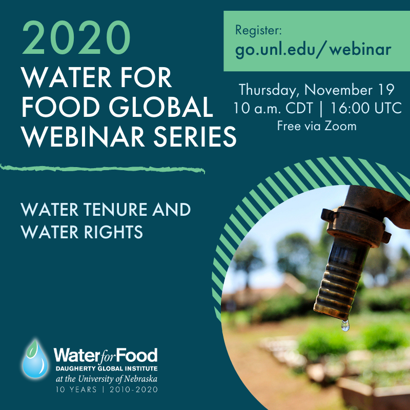 #Water4Food Webinar Series wraps next week! Experts discuss#waterrights,#watertenure and potential conflicts within context of productive and multiple uses of water, including with ag water scarcity and social conflict. Nov. 19 at 9 a.m. CST. REGISTER » https://go.unl.edu/webinar pic.twitter.com/6V51kGSsv4