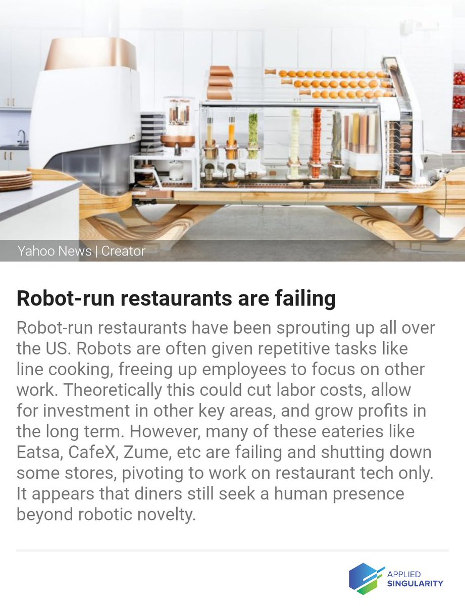 Read "Robot-run restaurants are failing" https://news.yahoo.com/san-franciscos-robot-run-restaurants-140300595.html … For more, get the app at http://www.AppliedSingularity.com/app