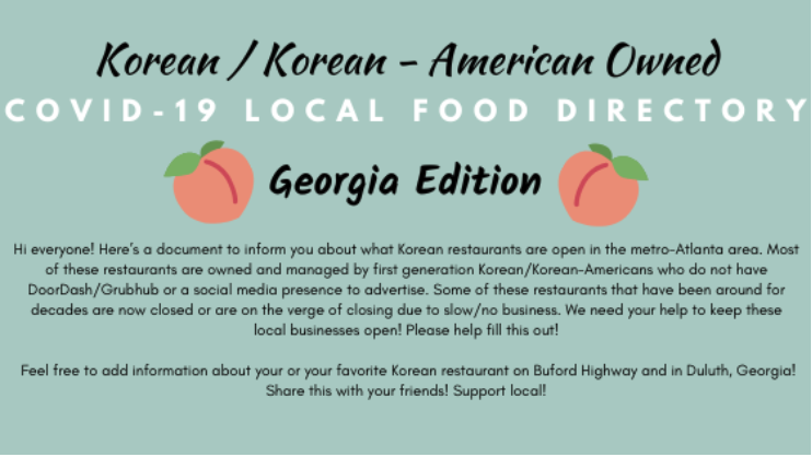Korean/ Korean American Owned Covid19 Local Food Directory metro-ATL area! share the link, add your favorite restaurant and order from any of these amazing restaurants! Support local, small businesses. Stay safe everyone! https://bit.ly/3dZX8hR pic.twitter.com/Y3sRL2tKtr