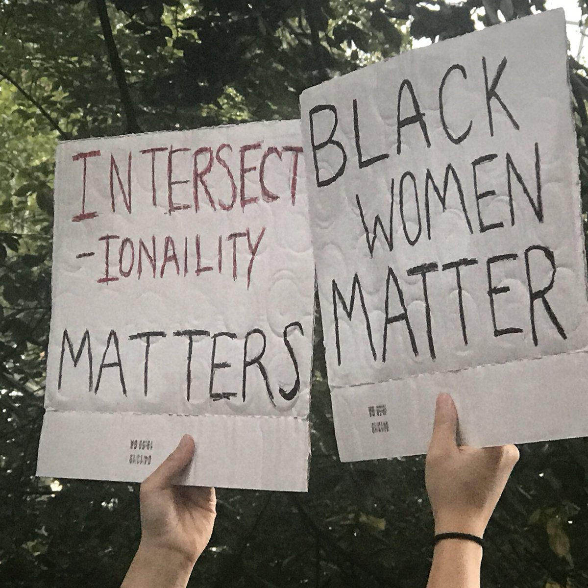 Description of image in previous tweet: Hands holding two hand-written signs. First sign says, "INTERSECTIONALITY MATTERS" Second sign says, "BLACK WOMEN MATTER"