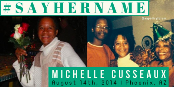 On this day in 2014, Phoenix police killed #MichelleCusseaux in her own home. Police were ill-prepared to support her mental health needs and ended her life instead of protecting it. When we can’t say their names, we can’t fight for justice. #SayHerName.pic.twitter.com/OqFyGJFFd8