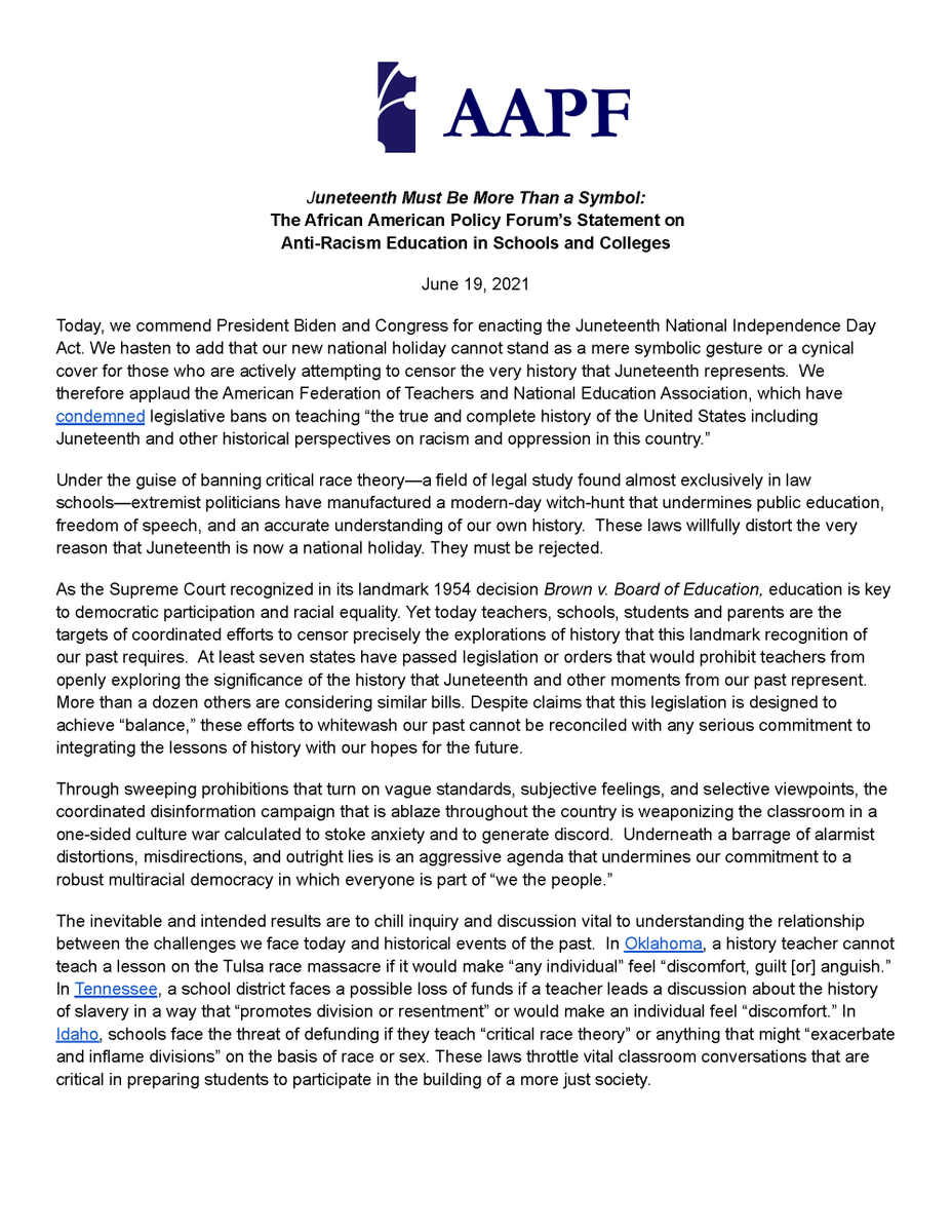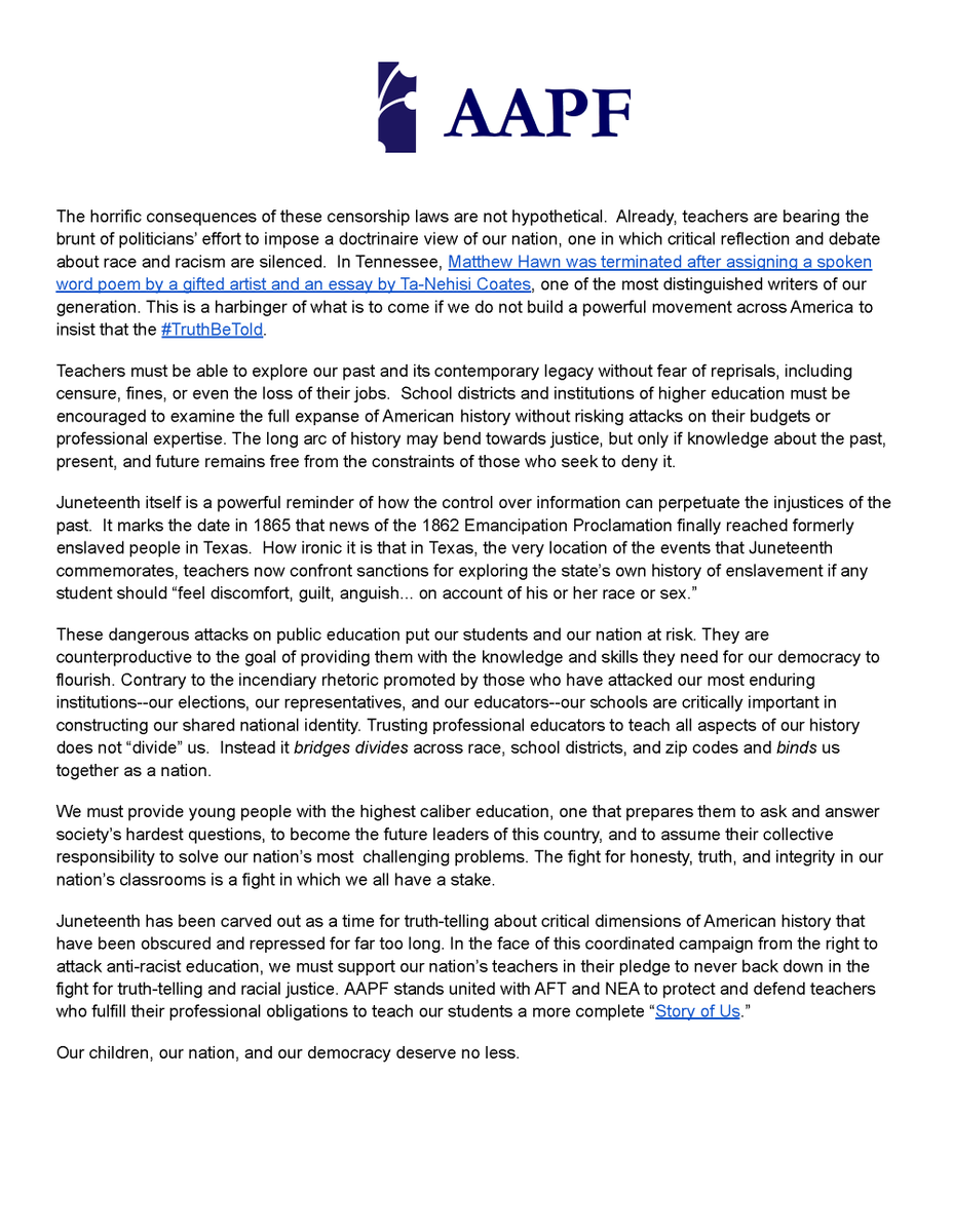 Juneteenth must be more than a symbol. As we celebrate Juneteenth, AAPF applauds the American Federation of Teachers & National Education Association for condemning state bans on teaching. Our statement on anti-racism education in schools & colleges: http://www.aapf.org/post/aapf-juneteenth … pic.twitter.com/bFZzIumBW2