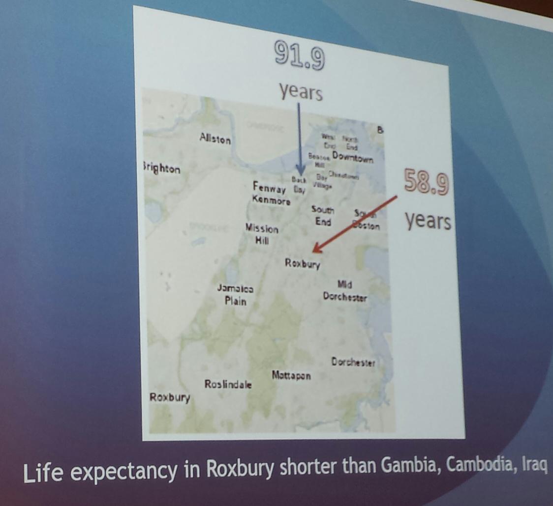 Map: "Life expectancy in Roxbury, MA is shorter than Gambia, Iraq" MT @laxswamy: @BMCimRES talk pic.twitter.com/519teGGmMH #inequality #phealth