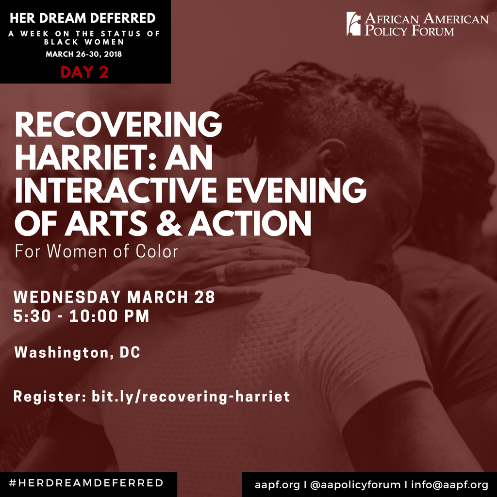 Are you a WOC in the DMV area? Want to learn more about Harriet Tubman's legacy & it's relevance 2day? Want to express yourself creatively with other WOC of all ages? Register to join us on Weds 3/28 for day 2 of #HerDreamDeferred!