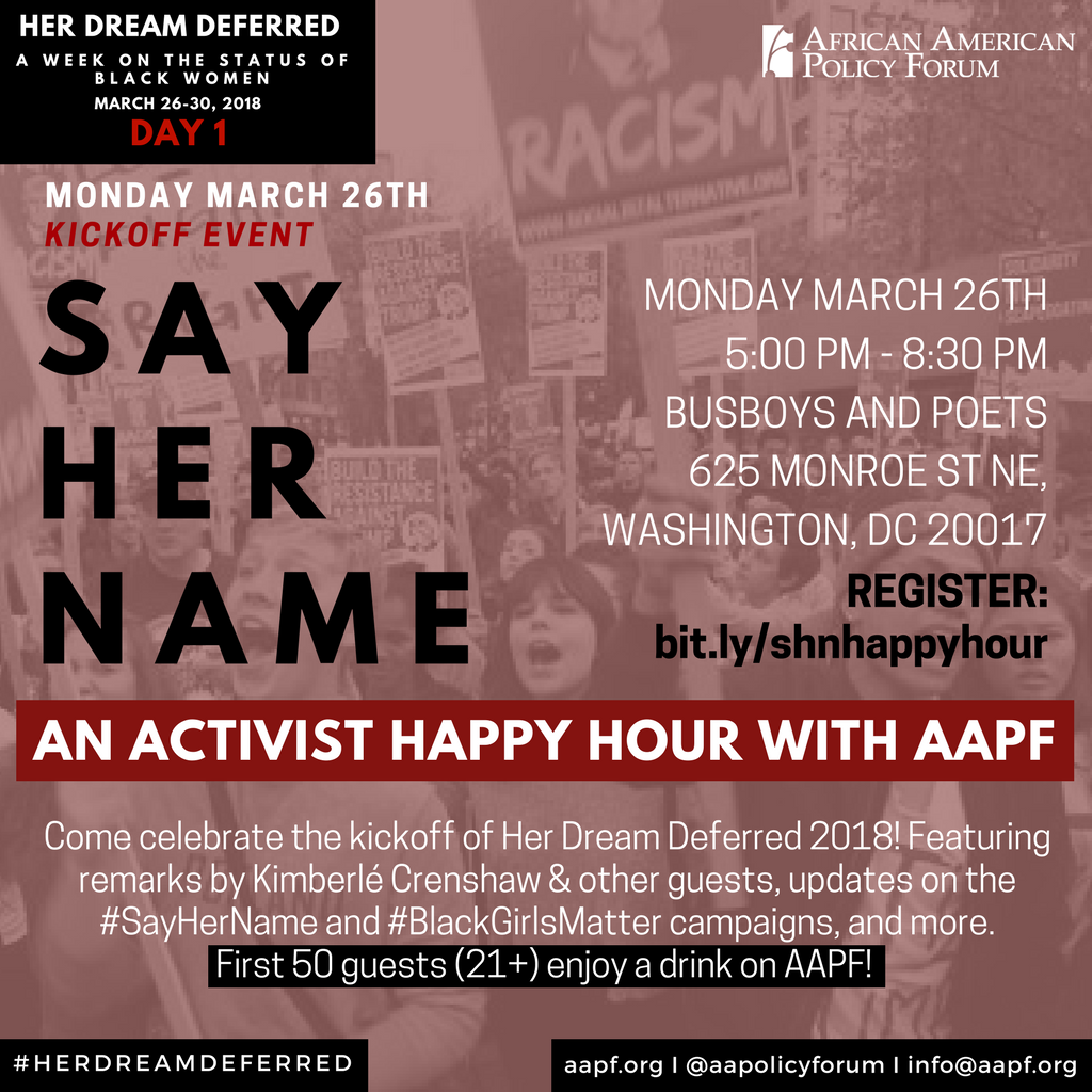 DC: Help us kick off #HerDreamDeferred in style! On 3/26, come celebrate the opening of AAPF's 4th Annual Week on the Status of Blk Wmn w #SayHerName: An Activist Happy Hour sponsored by @busboysandpoets First 50 guests will get a free drink on us! RSVP: http://bit.ly/shnhappyhour pic.twitter.com/MEl1ZzDAvl