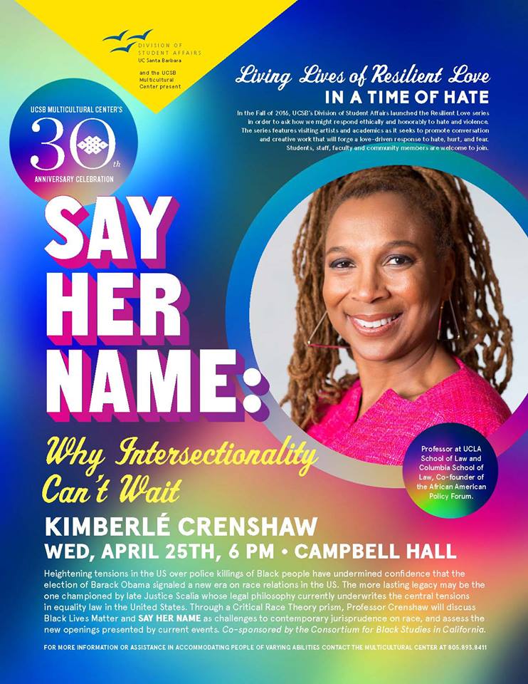 This week! Executive Director #KimberleCrenshaw will be presenting "#SayHerName: Why #Intersectionality Can't Wait' to the @ucsantabarbara community as part of their 'Living Lives of Resilient Love in a Time of Hate' speaker series. @ucsbmcc @sandylocks