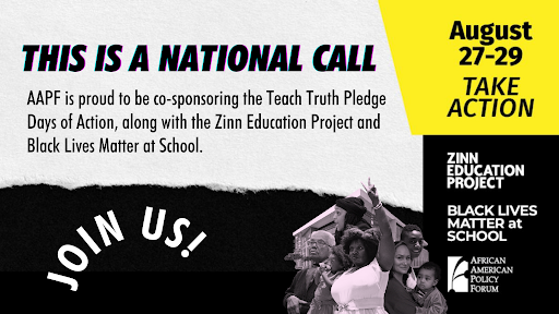 7. Along with Black Lives Matter at School and the Zinn Education Project, AAPF is proud to sponsor a national call for Days of Action on August 27-29 to encourage educators to sign the pledge to .