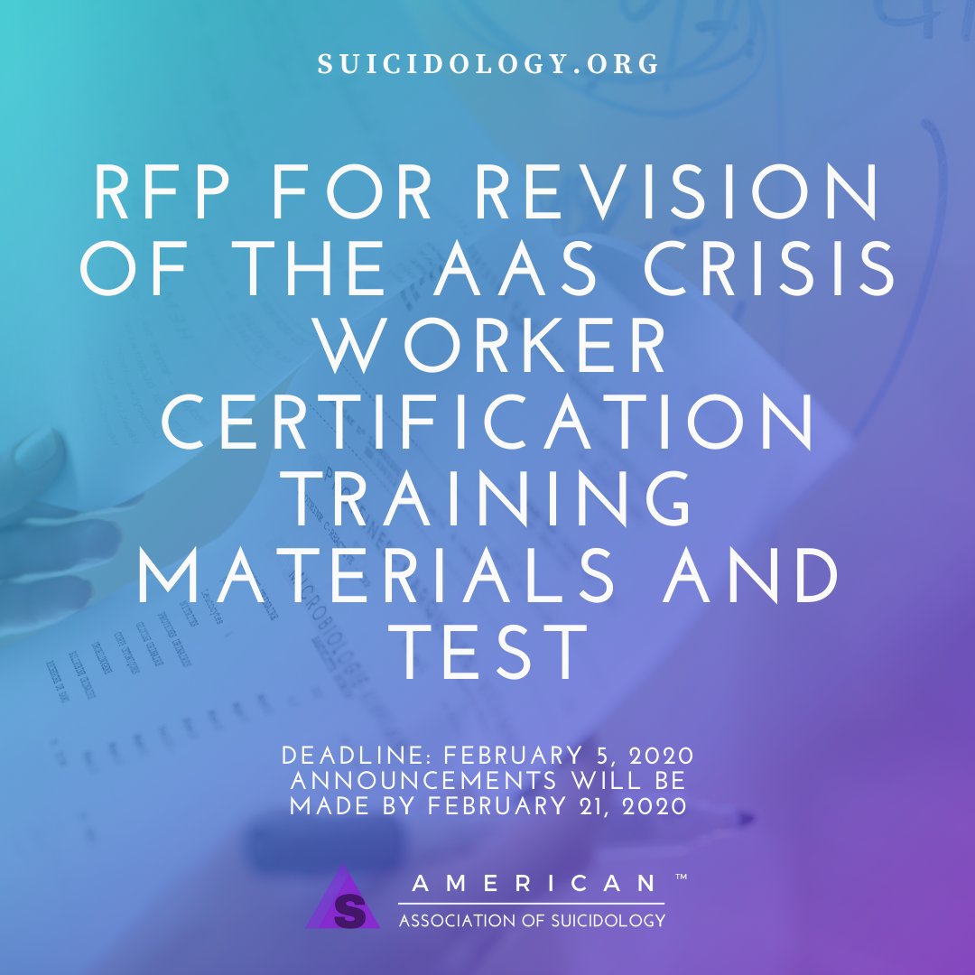 AAS is seeking a proposal to complete a revision of the AAS Crisis Worker Certification training materials and test. The total amount being pad for this project is $15,000. All work must be completed by April 10th, 2020. https://suicidology.org/2020/01/08/crisis-rfp/ …pic.twitter.com/Ed7igIugpM