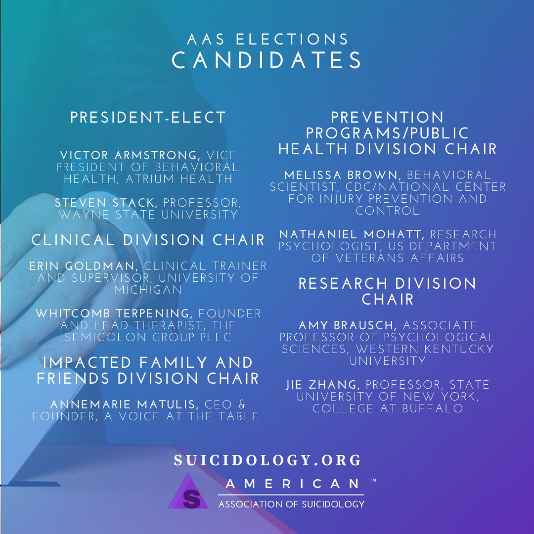 AAS Board Elections open 1/28, 9amEST; close at 3pmEST on 2/11. *** You must be a member as of 1/20/20 if you want to participate in the election.*** Members will be emailed from our voting service w/ info. Please send all questions/concerns to elections@suicidology.org.pic.twitter.com/lBs6rzCe29