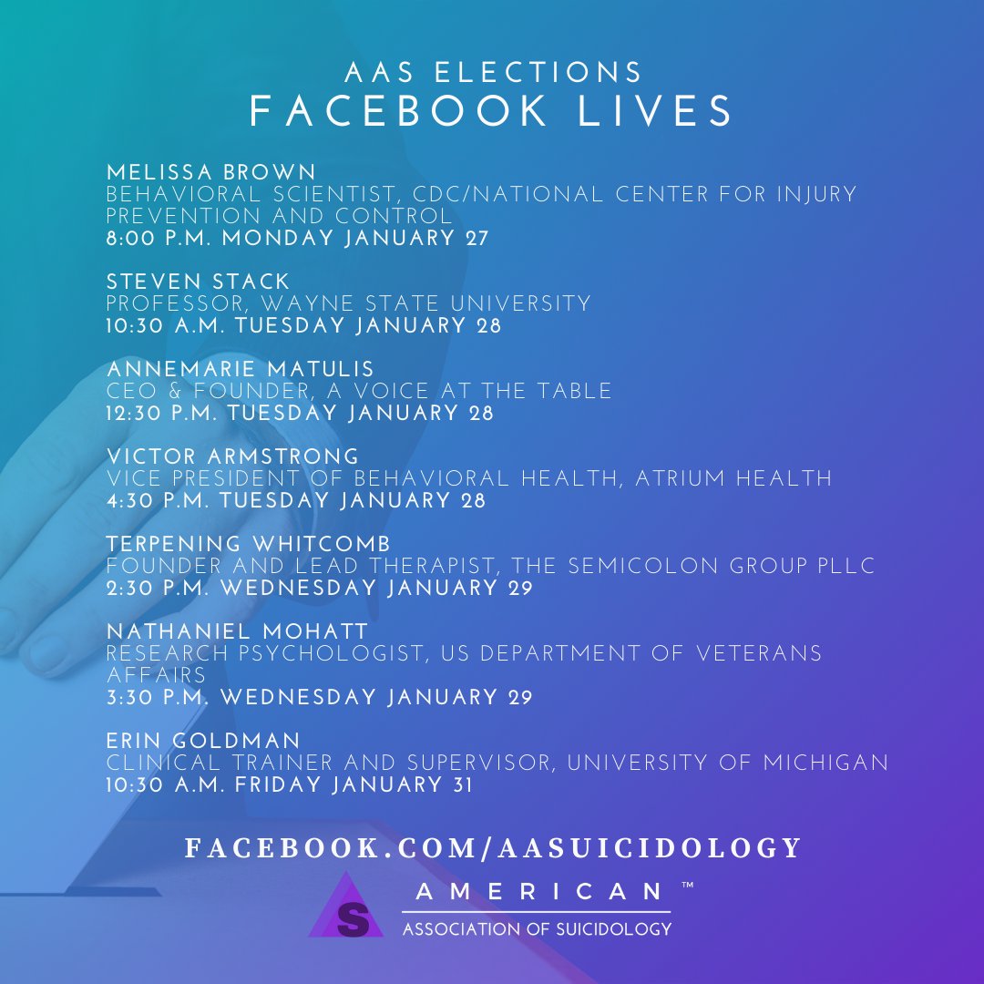 #FacebookLive interviews with the candidates. Tune in & then go vote! *Voting open to current members only; instructions will be emailed to you separately* http://Facebook.com/aasuicidology pic.twitter.com/9Mh9mo9zWM