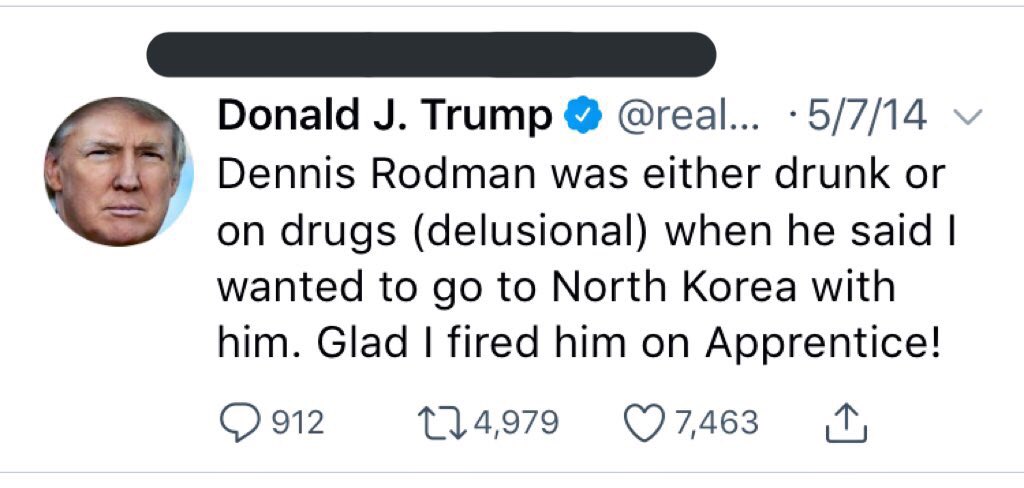 Rodman has been batshit crazy for a long time. Obama is a brilliant man and knew to stay far away from Rodmans nonsense. Kim wouldn't meet with Obama because he knew he couldn't manipulate an intelligent man. He is meeting with try p because he knows he can outplay him.