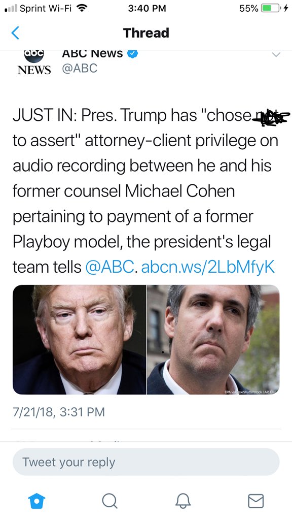 Tom; I will agree with this as well. Trump knows what he did. It isnt against the law because N.Y is a one party system when it comes to recording. If Cohen was PART of that convo then he can record. Trump knows and is just shitting himself.