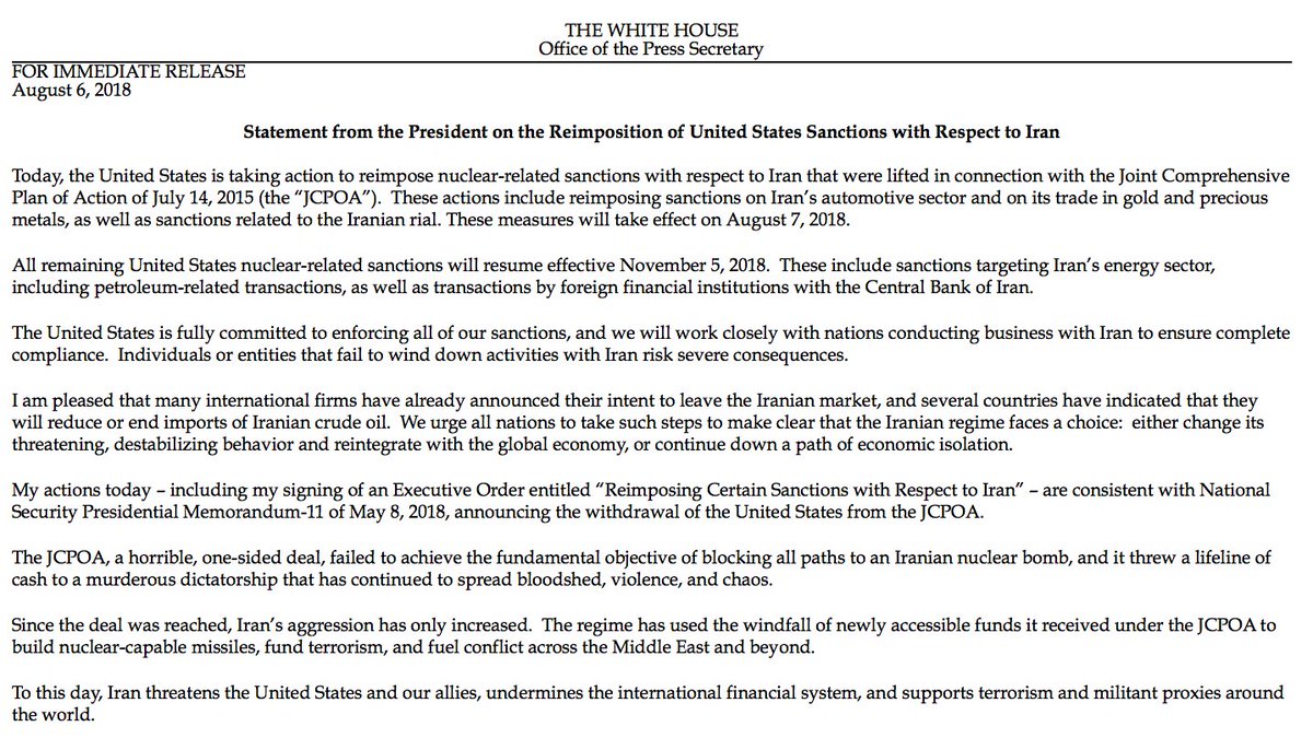 NEW: Trump admin reimposes sanctions "lifted under the horrible Iran deal." “Our policy is based on a clear-eyed assessment of the Iranian dictatorship, its sponsorship of terrorism, and its continuing aggression in the Middle East and all around the world,” Pres. Trump says.pic.twitter.com/QSs9CN8zXz