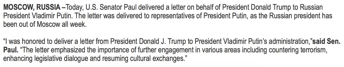 NEW: Sen. Rand Paul says he delivered letter on behalf of Pres. Trump to Russian Pres. Vladimir Putin during trip to Moscow; the letter was given to Putin's representatives. https://abcn.ws/2KBhWwl pic.twitter.com/hLLwNa5ikp