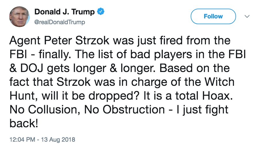 NEW: Pres. Trump celebrates firing of FBI agent Peter Strzok: "Finally. The list of bad players in the FBI & DOJ gets longer & longer." http://abcn.ws/2KNXYOU pic.twitter.com/R1LXmzbRRc