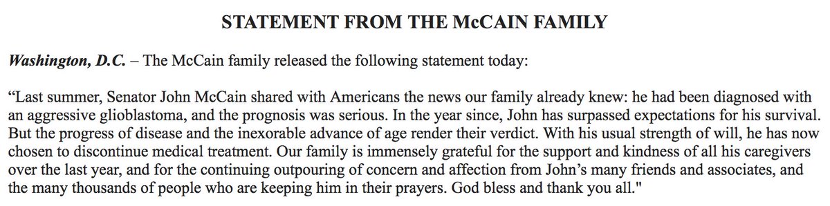 BREAKING: Sen. John McCain to discontinue brain cancer treatment, family says. https://abcn.ws/2PEEQqm pic.twitter.com/nEeQvaIIZY