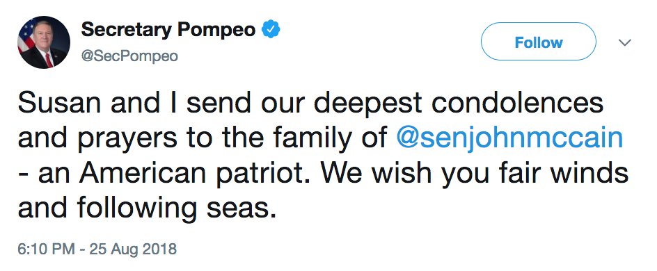NEW: Sec. of State Mike Pompeo: "Susan and I send our deepest condolences and prayers to the family of @senjohnmccain - an American patriot. We wish you fair winds and following seas." http://abcn.ws/2wqwlX6 pic.twitter.com/4Pnk2CeoTI