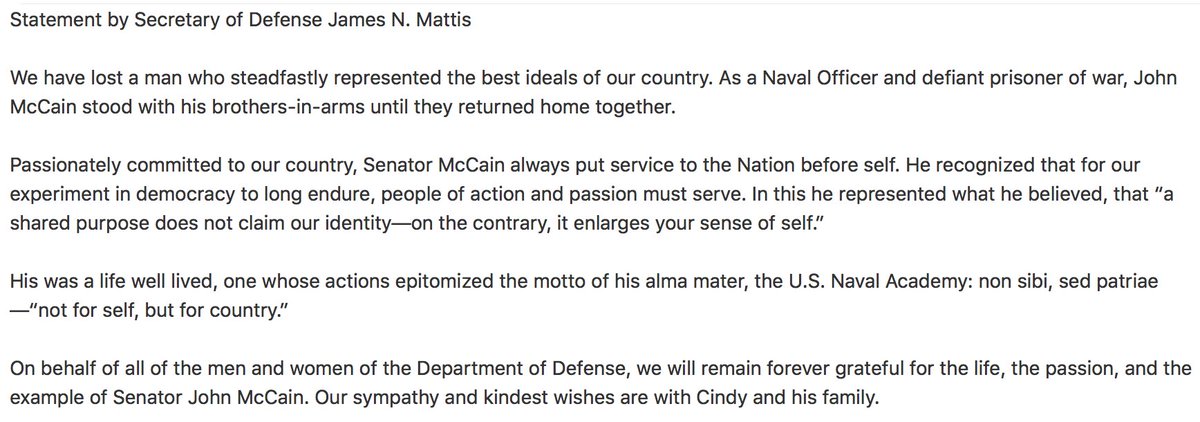 JUST IN: Defense Sec. James Mattis: "On behalf of all of the men and women of the Department of Defense, we will remain forever grateful for the life, the passion, and the example of Senator John McCain." http://abcn.ws/2PF8ADs pic.twitter.com/8lY4s8AgnQ