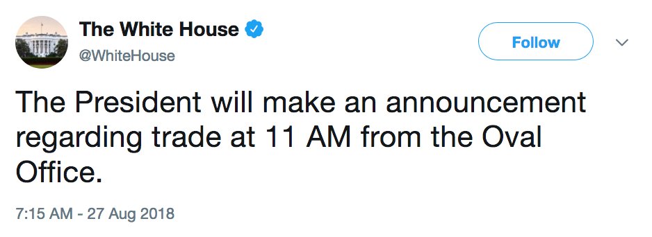 JUST IN: Pres. Trump to make Oval Office announcement on trade, White House says. https://abcn.ws/2PIauD9 pic.twitter.com/nc4A9vCxS6