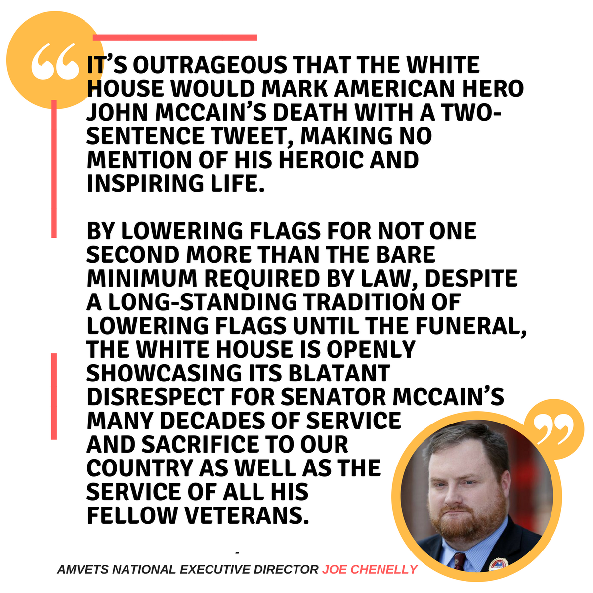NEW: American Veterans "is deeply disappointed in the lack of traditional and appropriate respect in the White House’s reaction to the death of U.S. Senator John S. McCain...who gave 60 years of honorable service to his country." https://abcn.ws/2P9ceEo pic.twitter.com/u9z6lInJMk