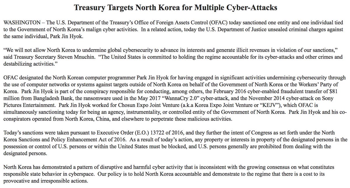 NEW: U.S. sanctions "one entity and one individual tied to the Government of North Korea’s malign cyber activities." “The United States is committed to holding the regime accountable for its cyber-attacks and other crimes and destabilizing activities," Sec. Mnuchin says.pic.twitter.com/uSv29gJHOw