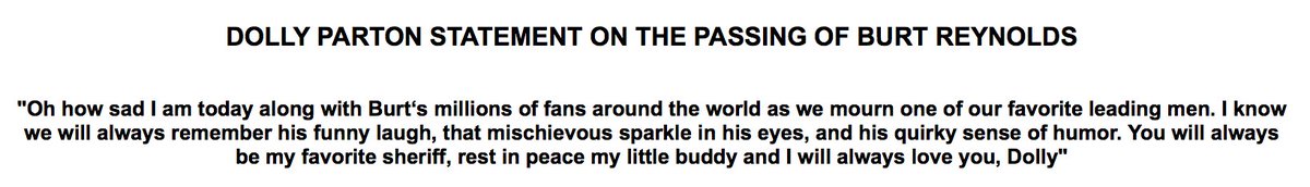 "Oh how sad I am today along with Burt‘s millions of fans around the world as we mourn one of our favorite leading men," Dolly Parton says. "You will always be my favorite sheriff, rest in peace my little buddy and I will always love you, Dolly." http://abcn.ws/2wSf75g pic.twitter.com/DGTNRUHtDb