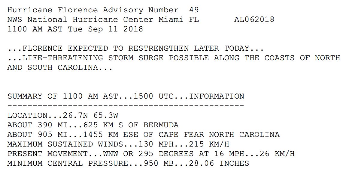 #Florence a Category 4 storm 670 miles ESE of Cape Fear, North Carolina, with maximum sustained winds of 140 mph. "This will likely be the storm of a lifetime for portions of the Carolina coast,” says the National Weather Service. http://abcn.ws/2CH1MTa pic.twitter.com/an4Ff2lKfkShow this thread