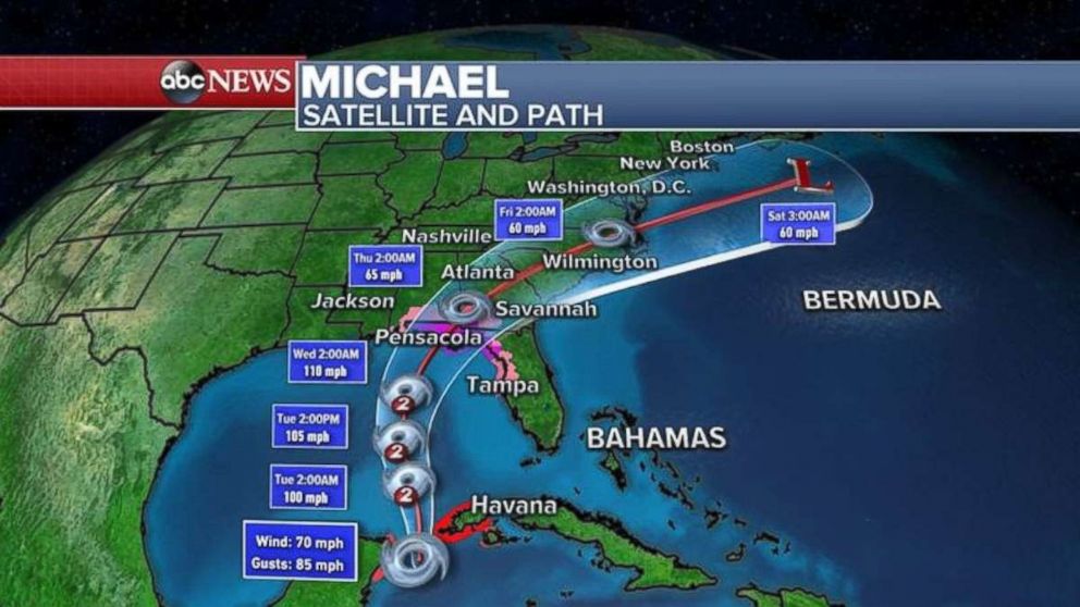 LATEST: - Tropical Storm Michael has maximum sustained winds of 70 mph. - It is located 120 miles east-northeast of Cozumel, Mexico. - Officials believe storm could strengthen into a Category 2 hurricane by the time it makes landfall midweek. https://abcn.ws/2Piwp3j pic.twitter.com/MXM62PS0tu