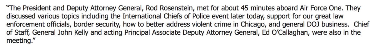NEW: Pres. Trump, Rosenstein "discussed various topics including the International Chiefs of Police event later today, support for our great law enforcement officials, border security, how to better address violent crime in Chicago, and general DOJ business," White House says.pic.twitter.com/CSKpDYM43D