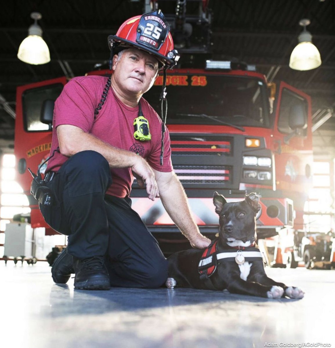 This is so great. Even better that both sides, victims and fire fighters, benefit from having these cute pups around!