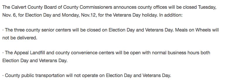 Calvert County MD shuts down public transportation for election day nov 6https://twitter.com/postcards4USA/status/1059227903588794368 …
