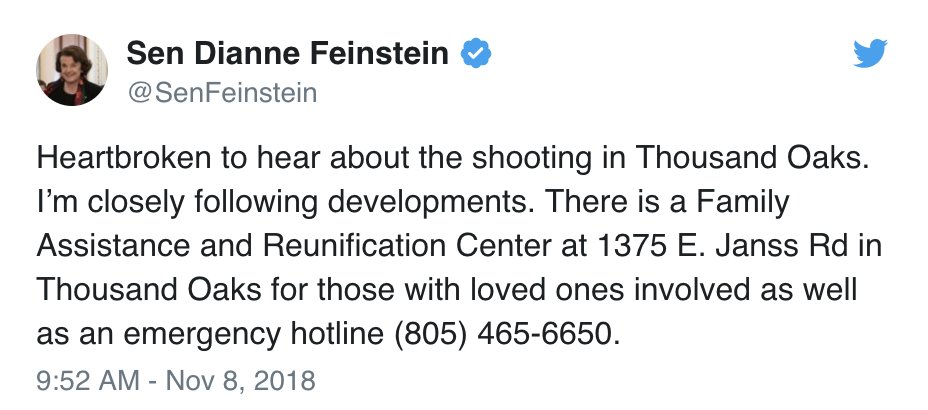 NEW: Sen. Dianne Feinstein: "Heartbroken to hear about the shooting in Thousand Oaks. I’m closely following developments." http://abcn.ws/2Du6gMM pic.twitter.com/m1FR3B4fhU