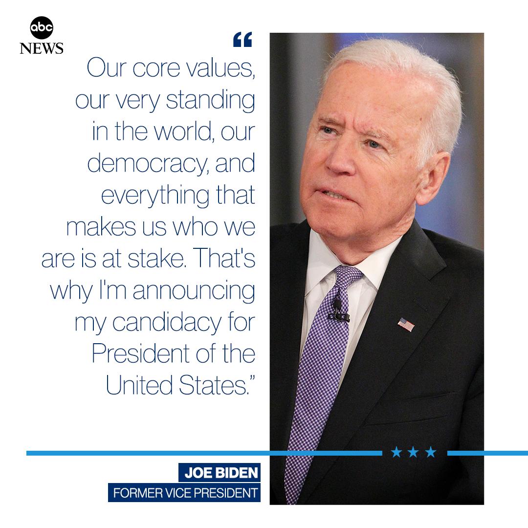 "Our core values, our very standing in the world, our democracy, and everything that makes us who we are is at stake." Former Vice Pres. Joe Biden formally announces that he's running for president in 2020. http://abcn.ws/2ZyJBqf pic.twitter.com/4trPiGVQKE
