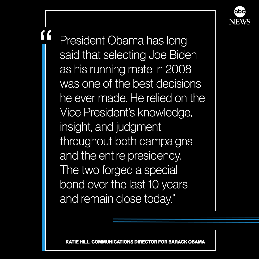 Spokesperson for former Pres. Barack Obama: "President Obama has long said that selecting Joe Biden as his running mate in 2008 was one of the best decisions he ever made." http://abcn.ws/2ZyJBqf pic.twitter.com/GcwP5oOdIm