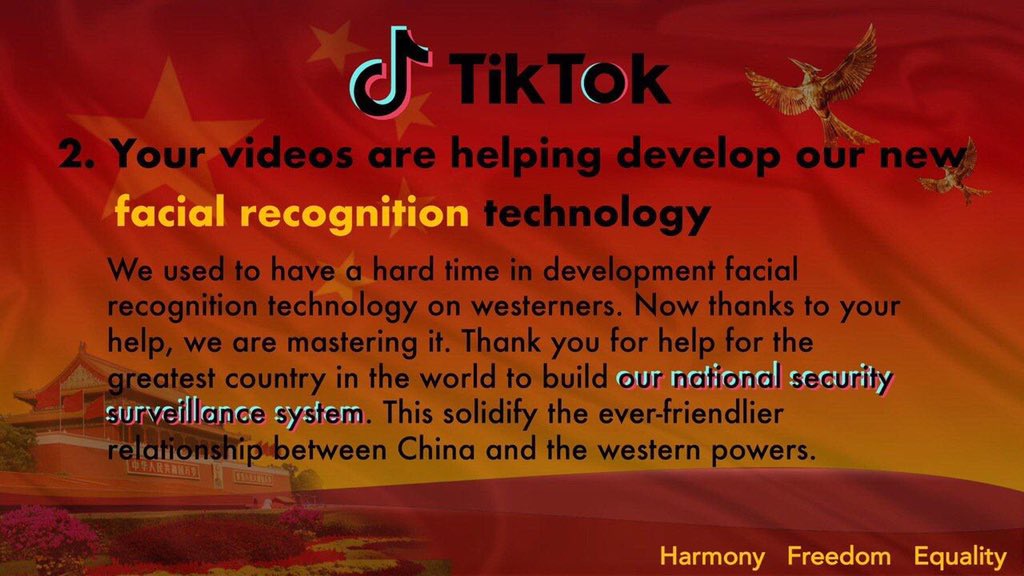 #TikTok is owned by Beijing and it collects foreign users’ personal data and access of the user’s camera. When#CCP is using facial recognition technology for social credit system in China, can we trust that TikTok is without any security risk?pic.twitter.com/HzXtKC6C4J