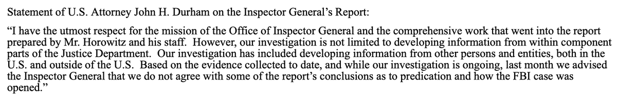 NEW: John Durham, who is leading separate investigation into origins of Russia probe: "While our investigation is ongoing, last month we advised the Inspector General that we do not agree with some of the report’s conclusions as to predication and how the FBI case was opened.”pic.twitter.com/dCX4yP0Q49